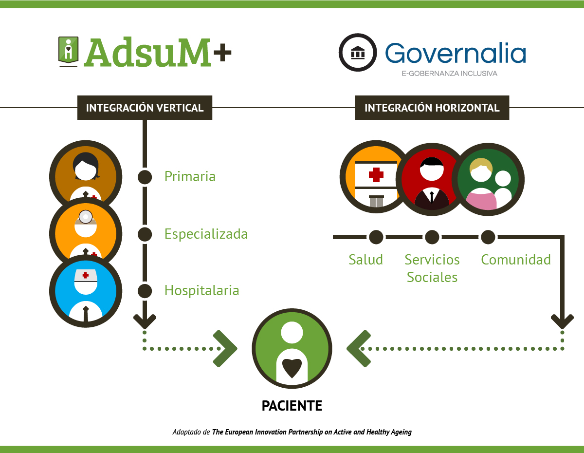 AdsuM+ propone un modelo muy pragmático de desplegar Cuidados Integrados tanto de forma Vertical (dentro de la parte clínica del sistema: Primaria – Especializada – Hospital) como de forma Horizontal (entre equipos clínicos y sociales), creando un “Círculo de Cuidados Multi-Disciplinar” en torno a la figura del paciente. Esto permite desplegar modelos de atención descentralizados que transfieren parte de la atención del Hospital (y otras instituciones) a Primaria y el Domicilio del paciente.